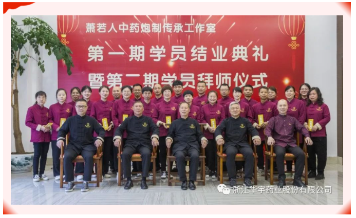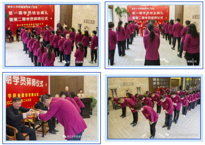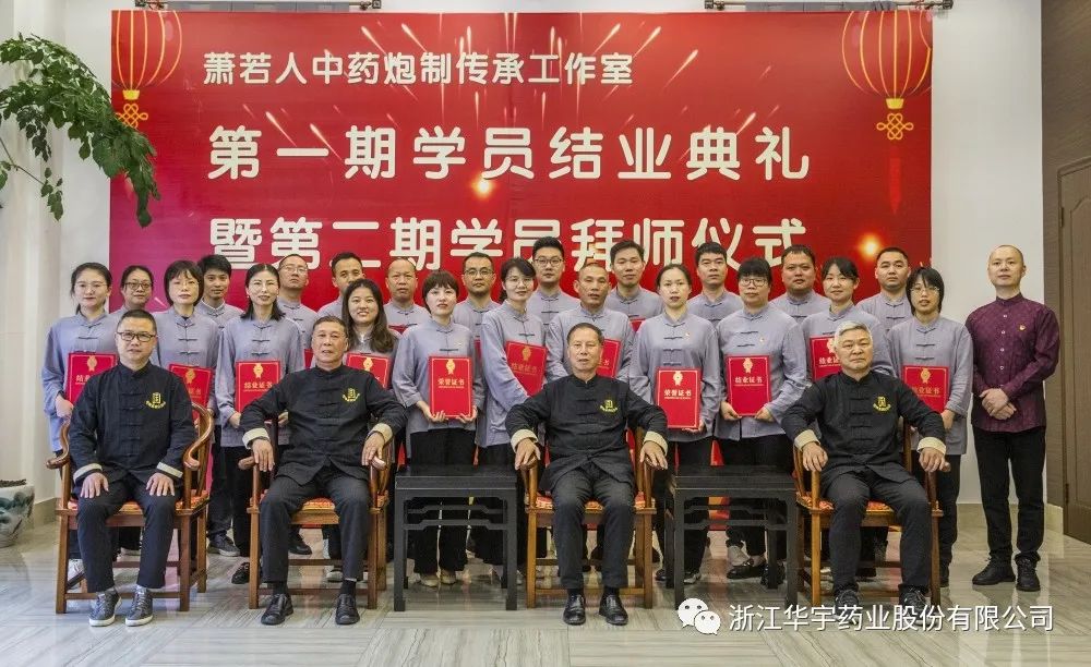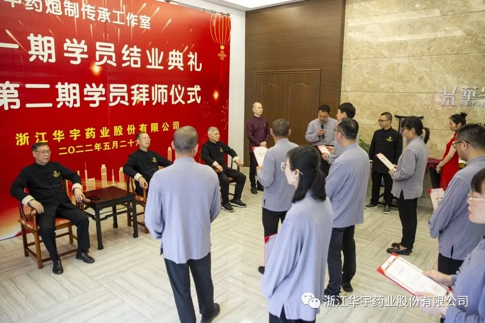 第二期24名華宇藥業(yè)各部門技術(shù)骨干人員,向中藥炮制傳承工作室創(chuàng)始人蕭若人、技術(shù)顧問錢光訓(xùn)、炮制顧問黃文星三位老師呈上《拜師帖》、